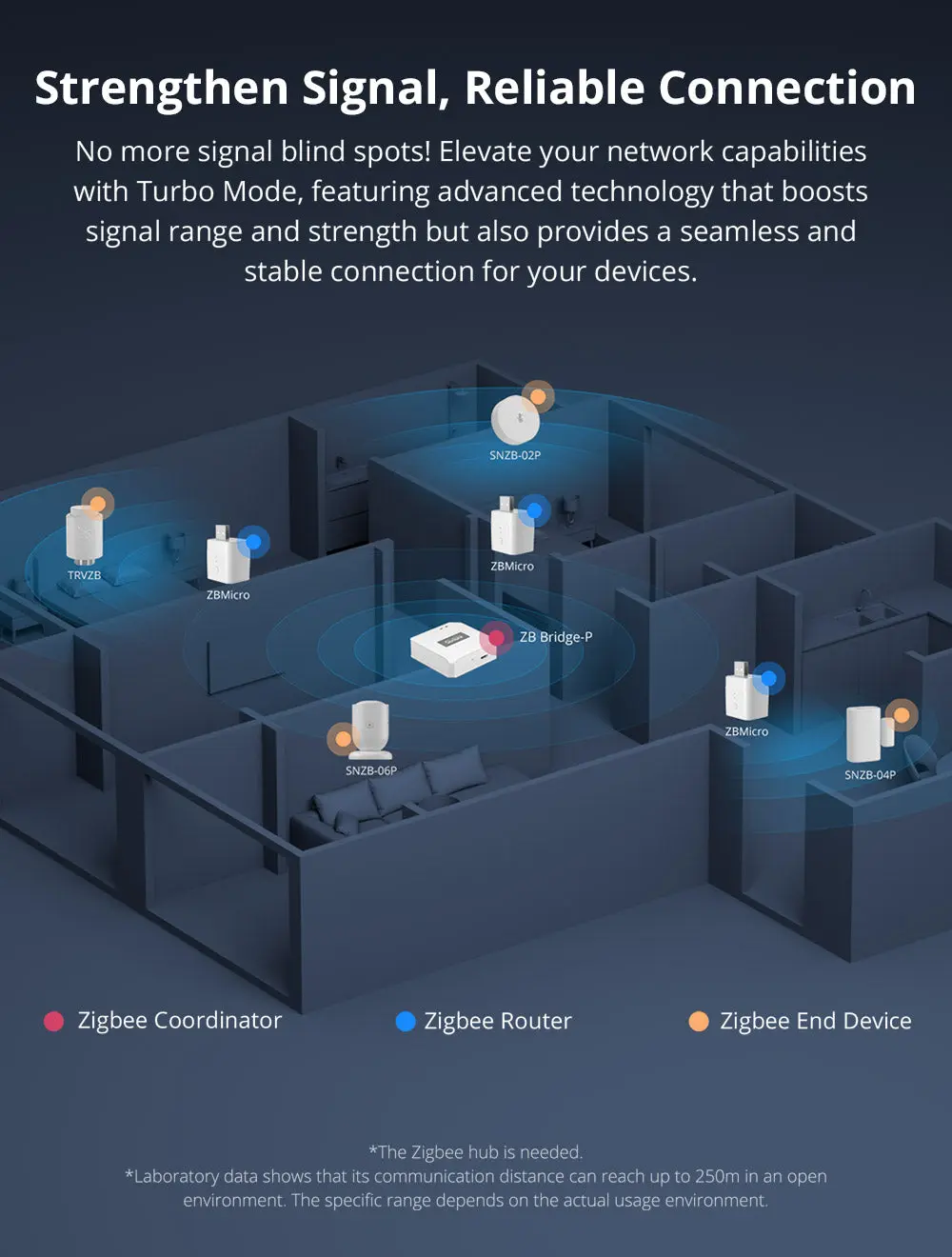 【Turbo Mode with Extended Coverage – Stronger Signal, Greater Reach】Boost your Zigbee network with Turbo Mode. This feature enhances Zigbee signal strength and coverage, ensuring more stable communication between your devices.