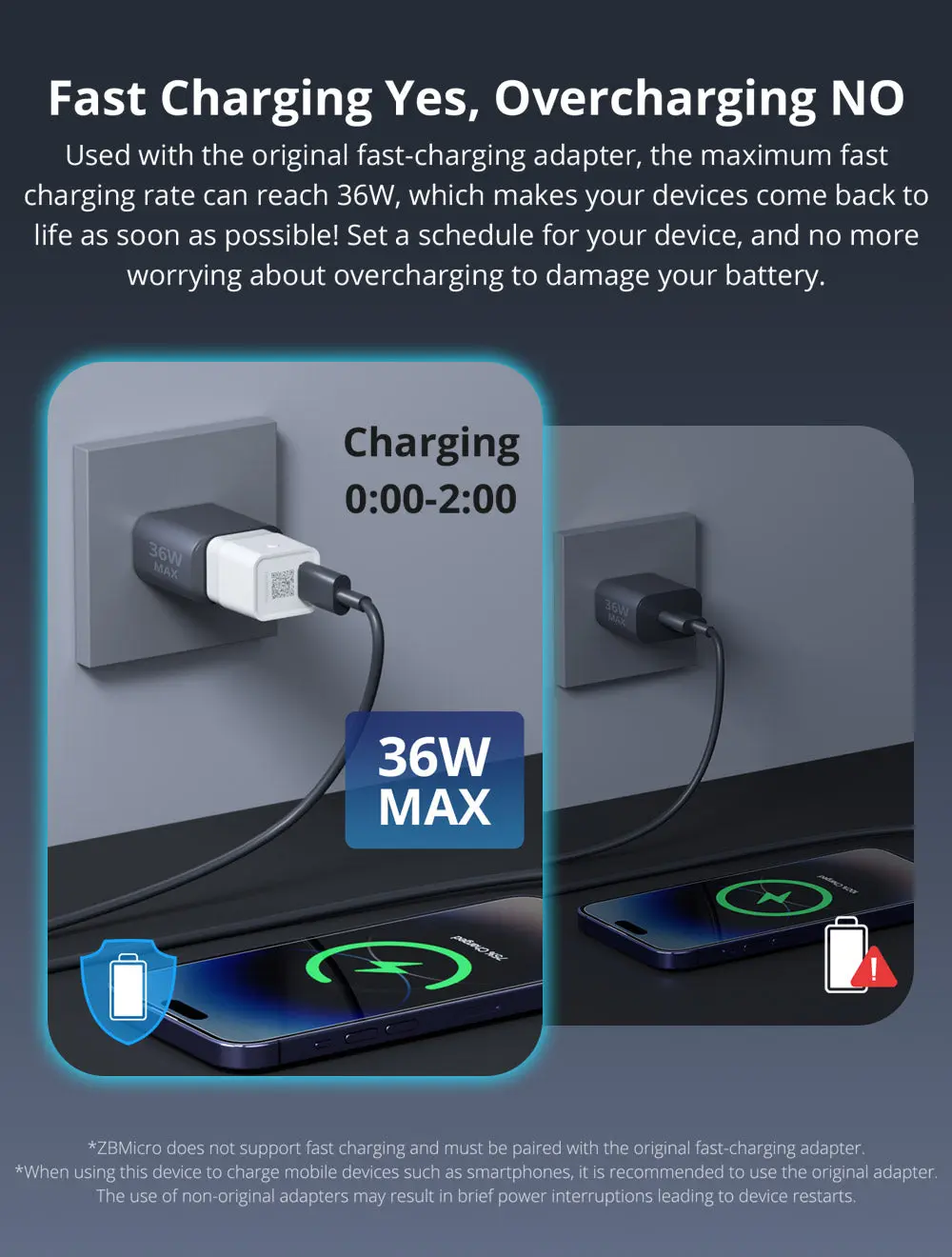 【Supports Up to 36W Fast Charging – Safer, Smarter Power Management】Pair it with your original fast-charging adapter to enable up to 36W output. You can schedule charging time to avoid overcharging, prolong battery life, and save energy—ideal for night-time charging or unattended device management.