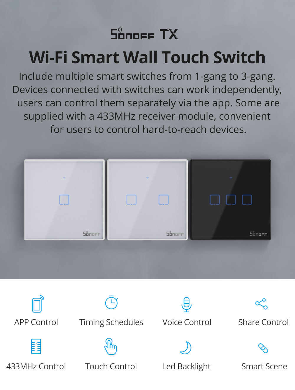 SONOFF TX Series WiFi Wall Switches combine modern touch control with smart automation. Manage lights remotely via the eWeLink App with real-time status sync, or use voice commands through Alexa and Google Assistant. You can create automated schedules for energy efficiency and convenience. With sleek design and seamless smart scene integration, TX Series offers stylish, hands-free control and customizable automation across your smart home.