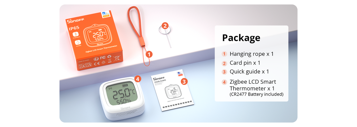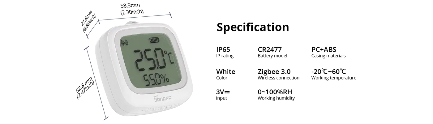 SONOFF SNZB-02WD is an IP65-rated Zigbee 3.0 temperature and humidity sensor with a 2.2″ LCD for real-time monitoring in indoor or humid environments. Its advanced waterproof housing and breathable membrane ensure stable performance in humid, misty, or outdoor settings, while Swiss-grade precision provides ±0.2°C and ±2% RH accuracy. Ideal for bedrooms, greenhouses, kitchens, and bathrooms. You can seamlessly integrate with SONOFF iHost, NSPanel Pro, ZBBridge-P/U, ZBDongle-E/P, and other Zigbee ecosystems to automate climate control and access historical data via the eWeLink app.