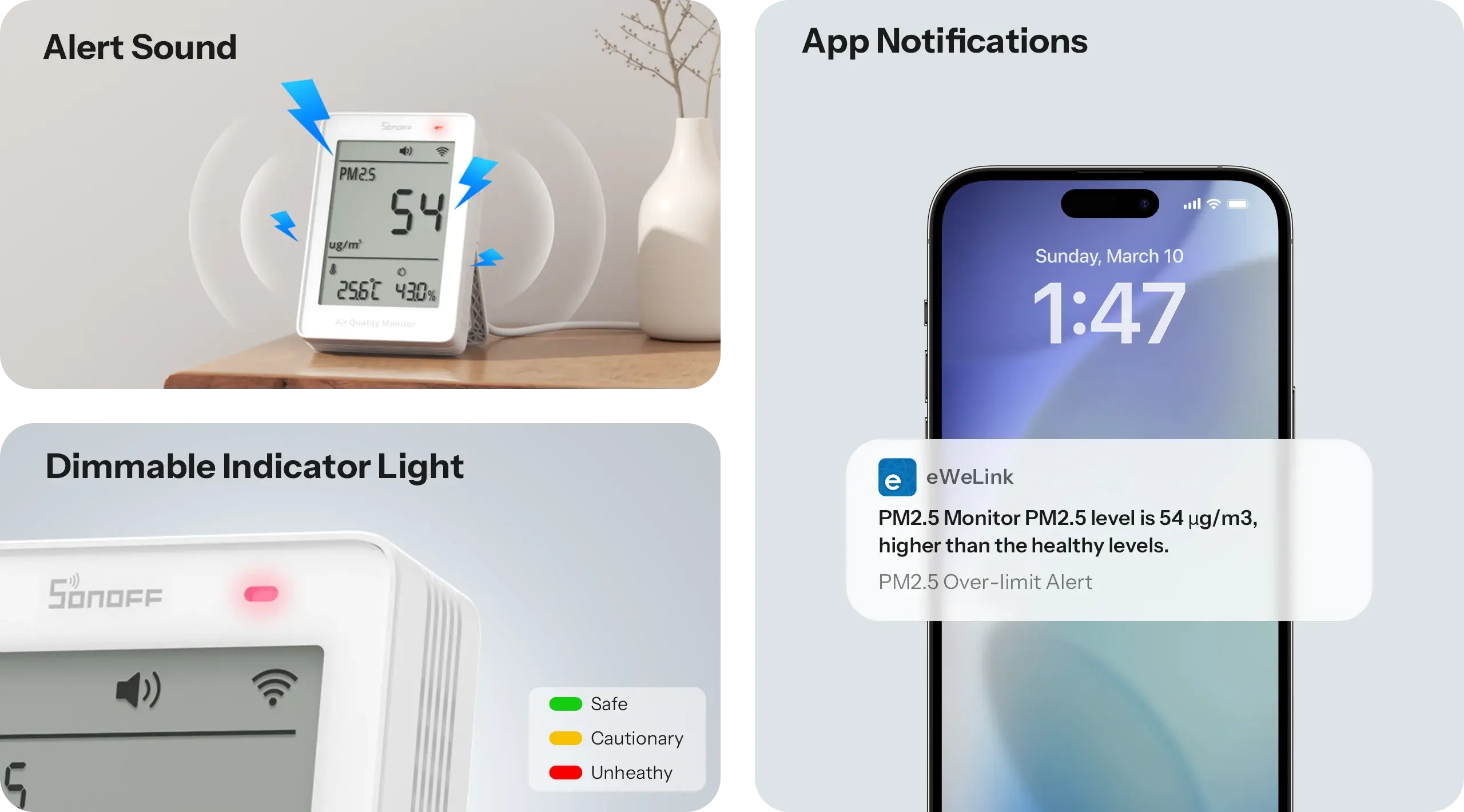 【3 Customizable Alert Methods】Features sound alerts, indicator-light warnings, and app notifications, ensuring you never miss critical air-quality changes and stay protected from poor indoor conditions.