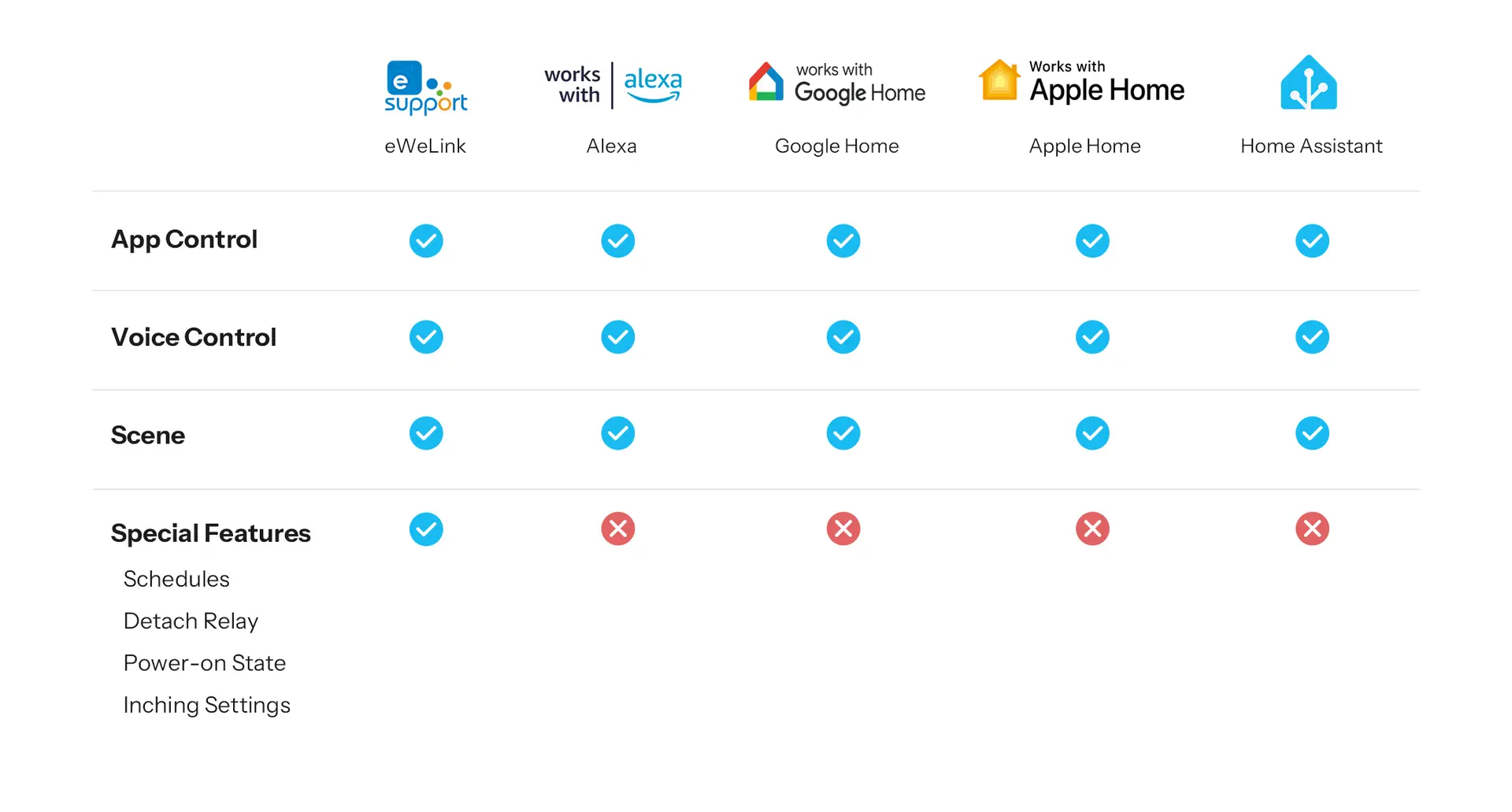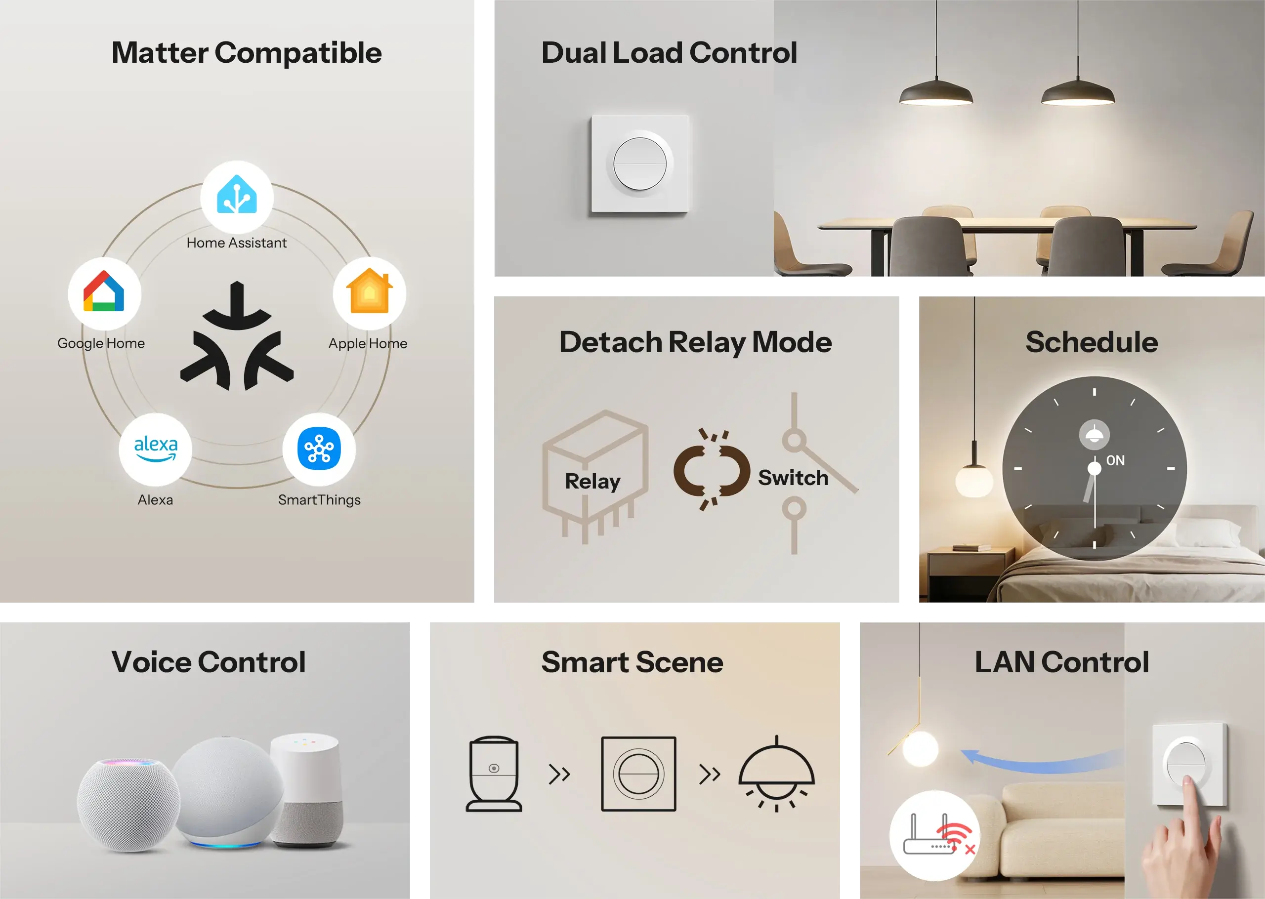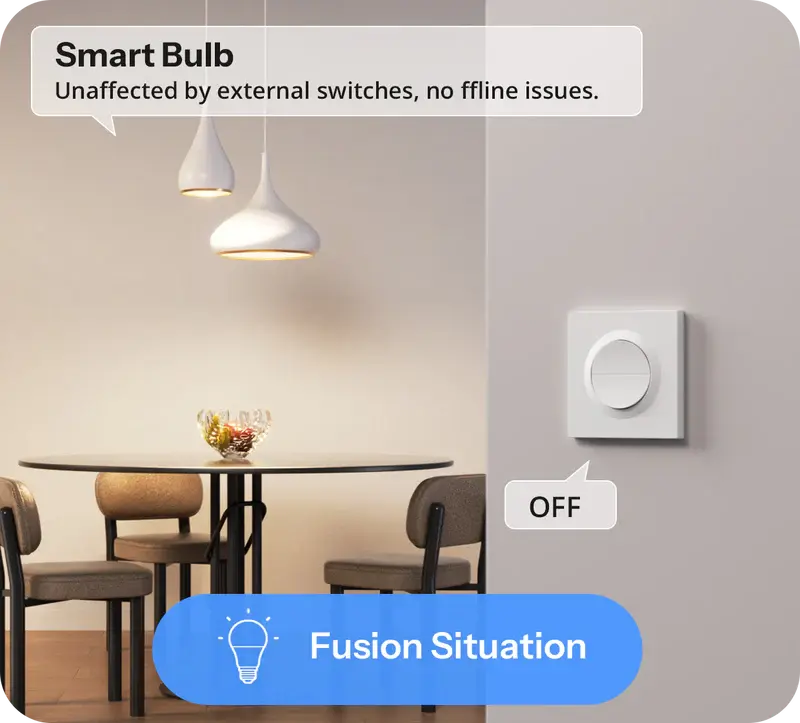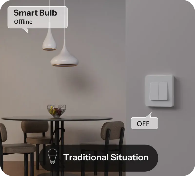 【Detach Relay Mode】Physical switches and smart control operate independently. Devices remain controllable via app or automation even when the wall switch is off, while physical control is restored during network outages.