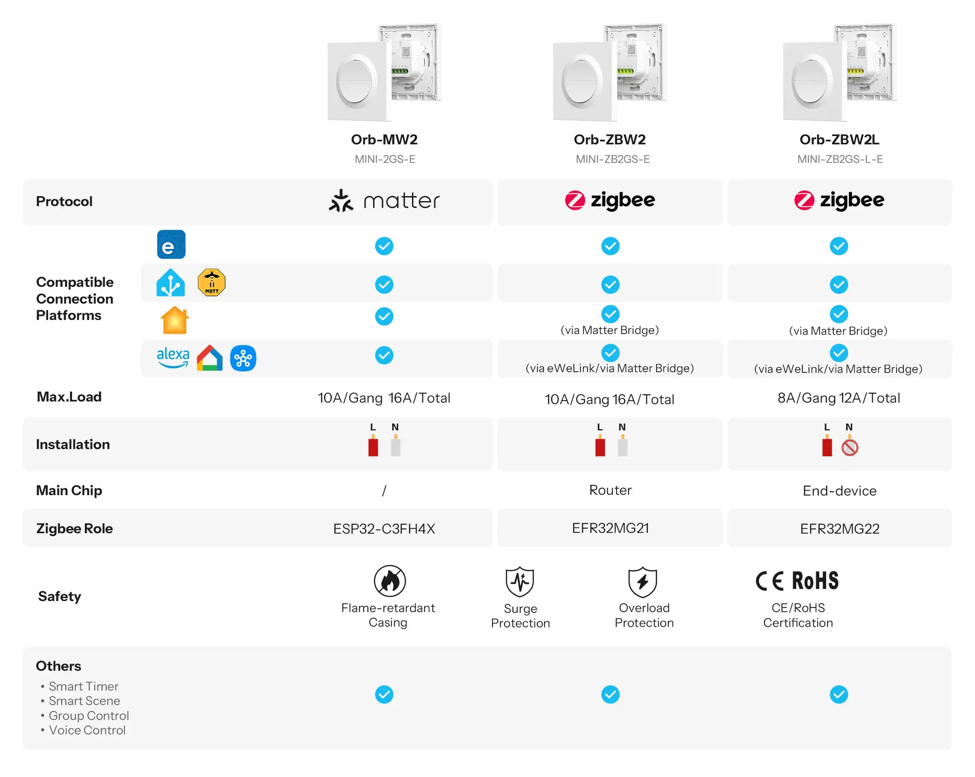 Orb-MW2 is a WiFi smart switch designed for flexible, reliable home control. With dual independently controlled channels, it manages two circuits simultaneously with a combined load of up to 16A. Built on the Matter protocol, it integrates seamlessly with Apple Home, Google Home, and Amazon Alexa for cross-platform control. Detach Relay Mode keeps smart and physical control independent, ensuring reliable operation even during network outages. App, voice, and automation support enable smarter, more responsive living.