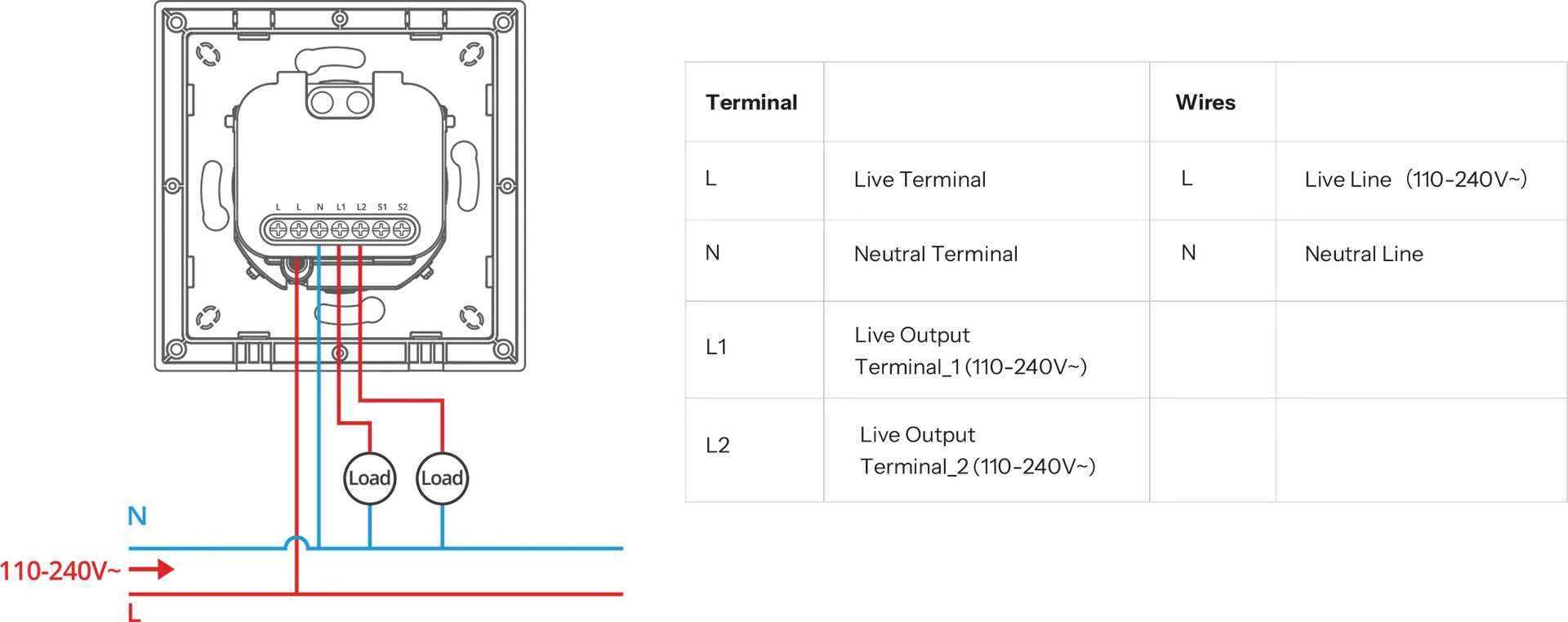 | Rated Specifications | 110–240V~ 50/60Hz, 10A per gang, Total 16A Max (Resistive Load) |