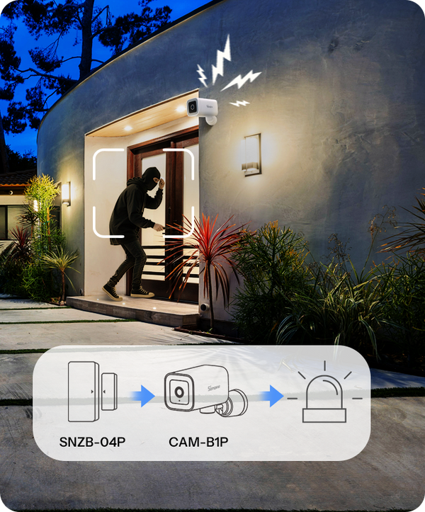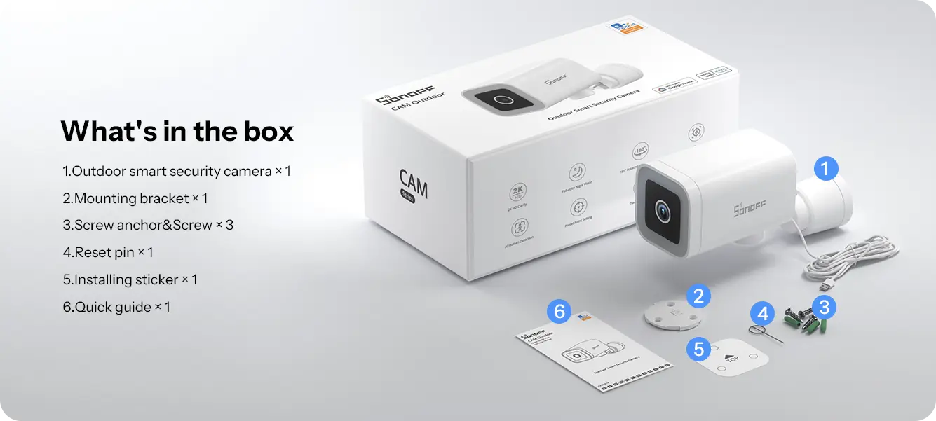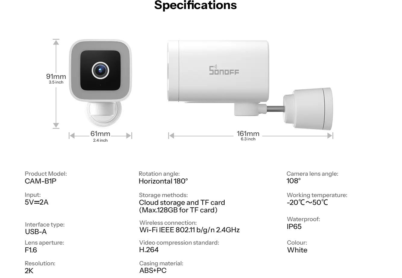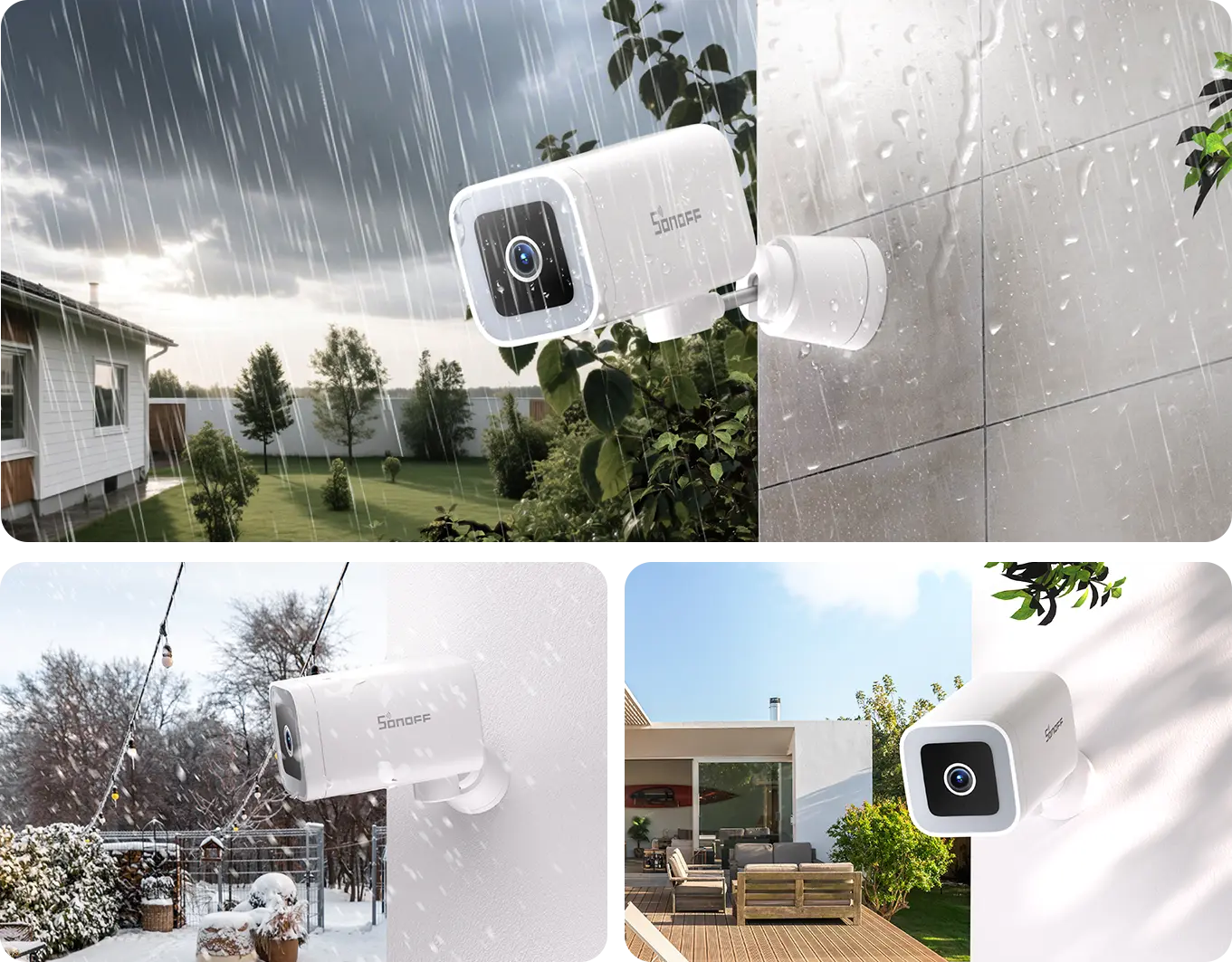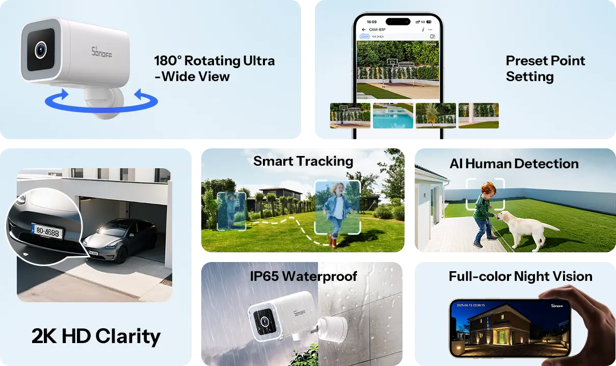 SONOFF CAM-B1P is a smart Wi-Fi outdoor camera that delivers 2K high-definition resolution and full-color night vision, ensuring clear and detailed footage day and night. Its 180° rotating ultra-wide lens expands coverage for comprehensive monitoring. Equipped with AI-powered human detection and intelligent tracking, it accurately identifies and follows suspicious targets in real time. It also supports preset position settings, allowing focused monitoring of key areas. With two-way audio, you can communicate instantly. With the IP65-rated waterproof and dustproof housing, the CAM-B1P performs reliably in various outdoor environments. The SONOFF CAM-B1P provides reliable smart security, giving you peace of mind anytime, anywhere.