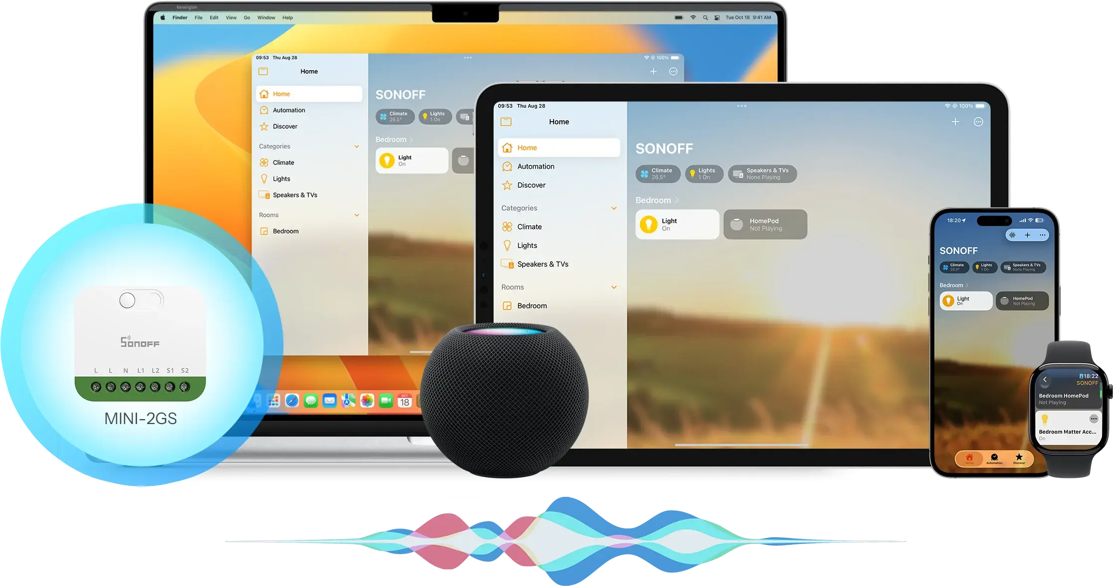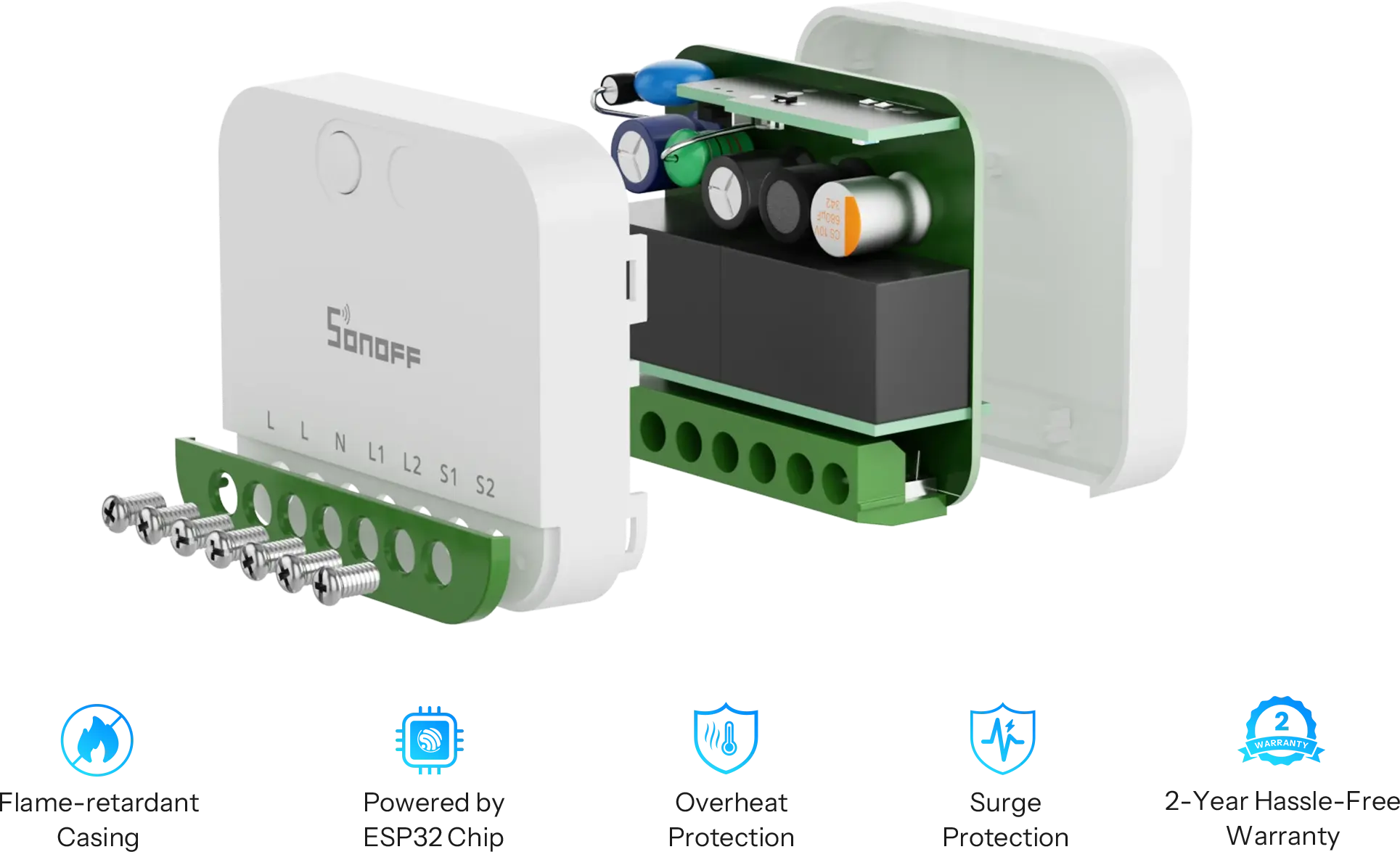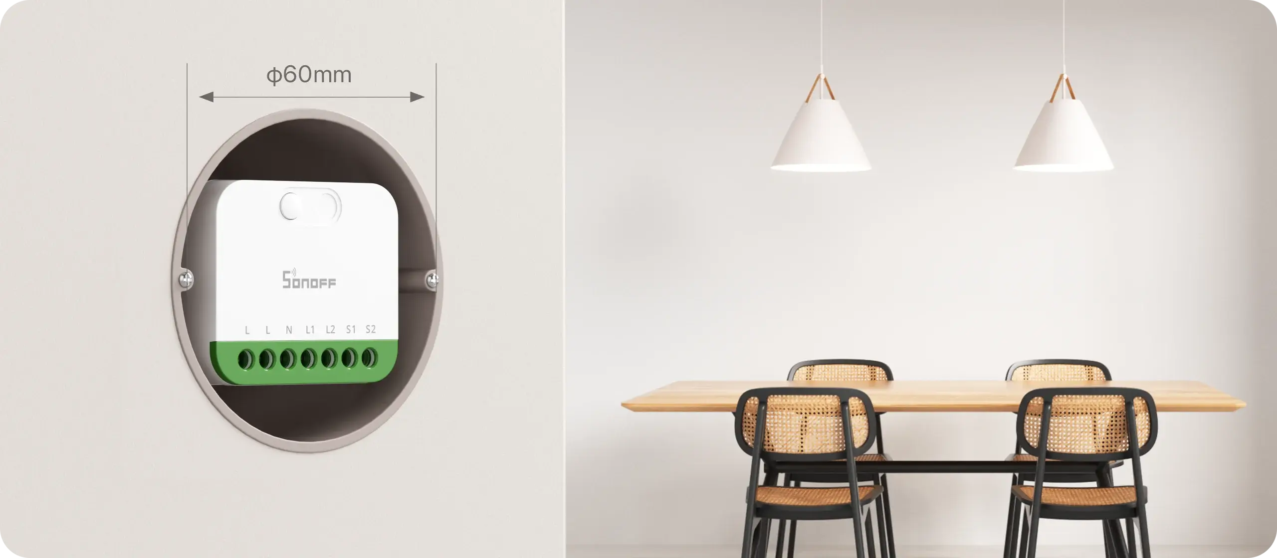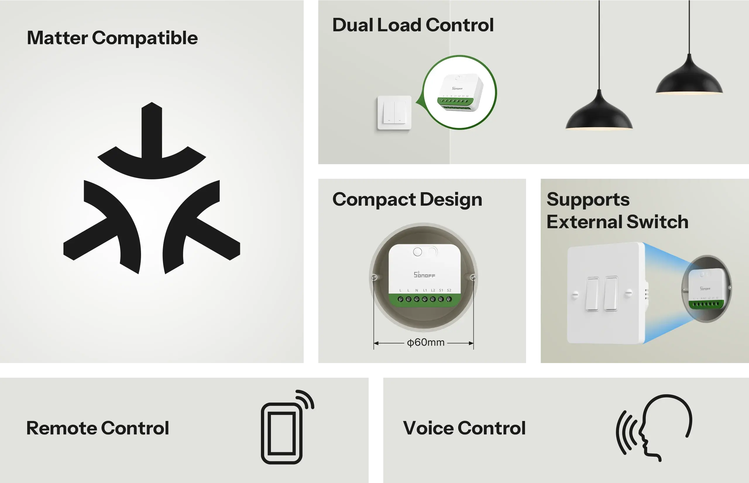MINI-2GS is a dual-load Wi-Fi smart switch that supports the Matter protocol, seamlessly integrating with Apple Home, Google Home, Alexa, and more. Its compact design fits perfectly into small wall-mounted junction boxes, including the European standard 60 type. Supporting up to 16A across two independent channels, it offers flexible load control. With app and voice control, detach relay mode, and support for automated scenes, MINI-2GS brings smarter, more convenient home automation to any space.