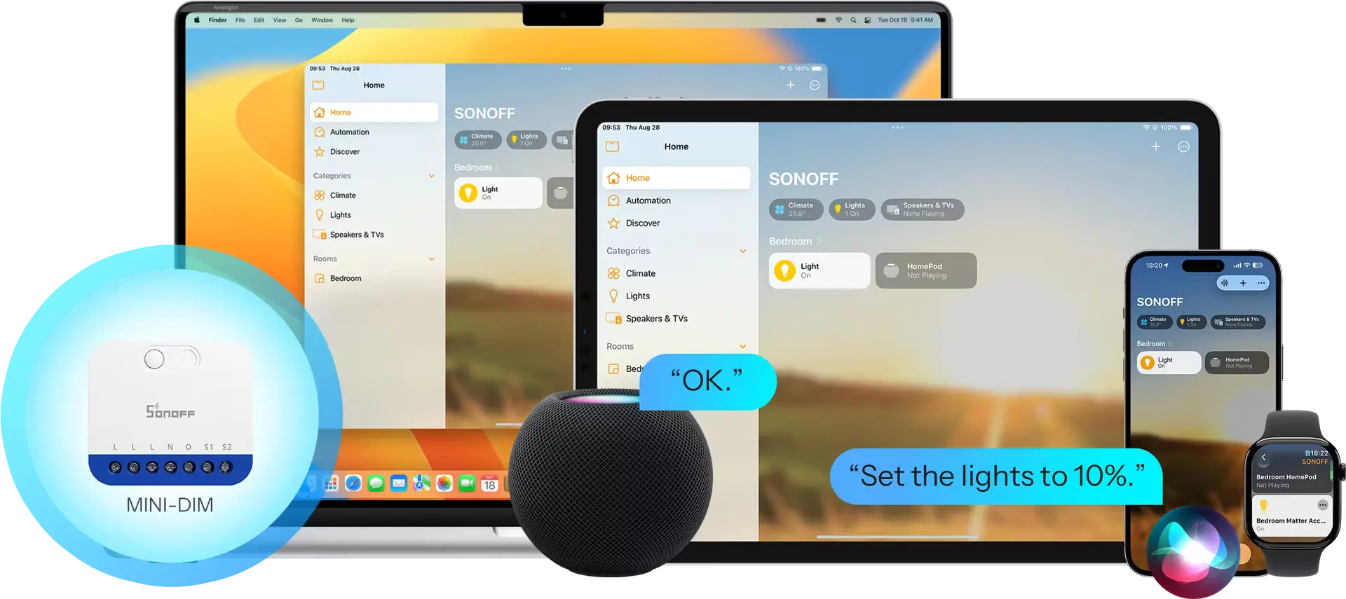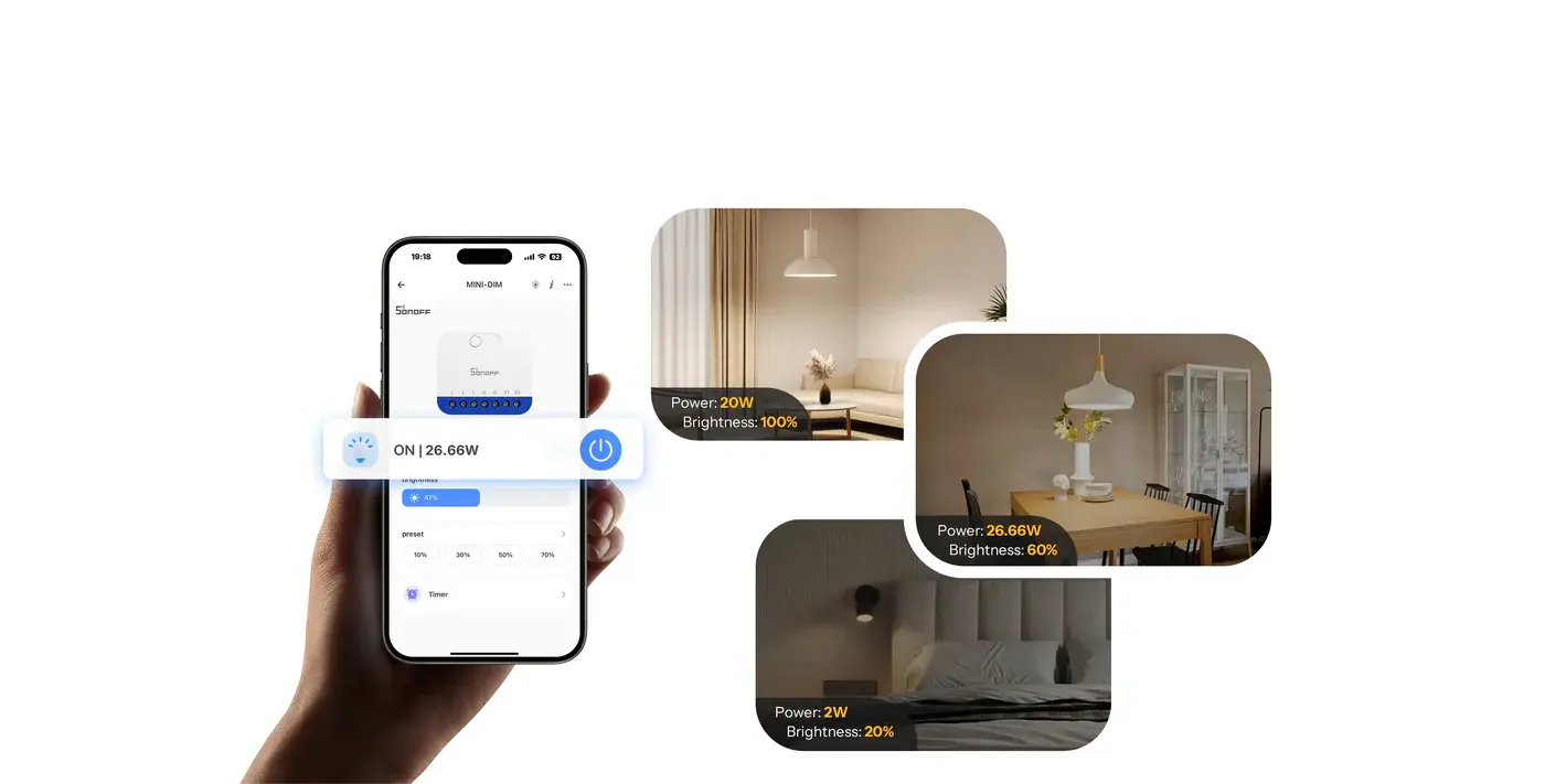 MINI-DIM is a Matter over Wi-Fi smart dimmer switch designed to upgrade traditional lighting with intelligent, precise dimming control. It supports a wide range of lighting types, including dimmable LEDs, incandescent and halogen lamps, and electronic transformers. With auto or manual calibration, MINI-DIM delivers smooth, flicker-free dimming from the lowest to the highest brightness. Integrated with Apple Home, Google Home, and Amazon Alexa, it enables smart scenes, voice control, and cross-platform automation. Real-time power monitoring and built-in overheat protection further ensure safe, reliable, and efficient operation for modern smart homes.