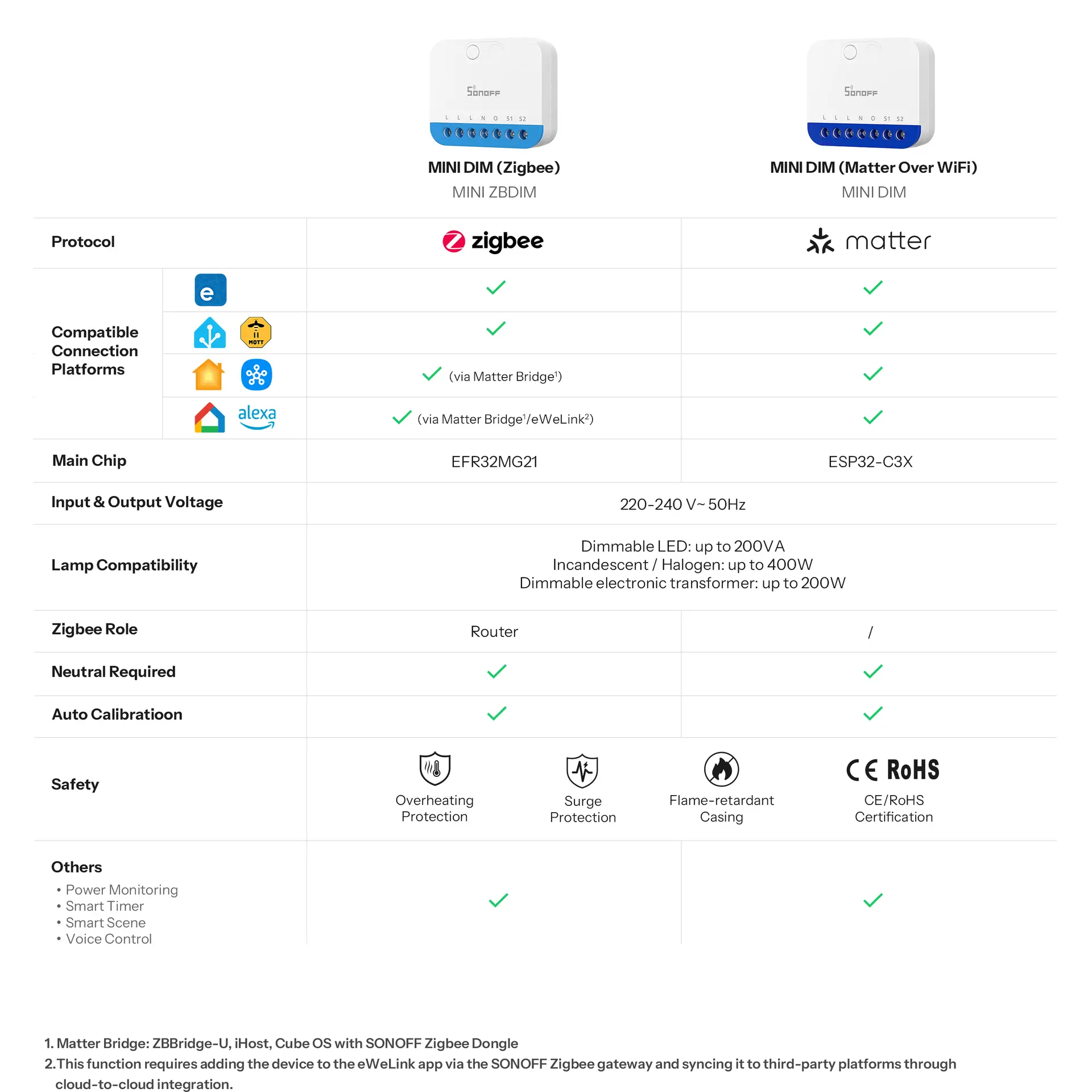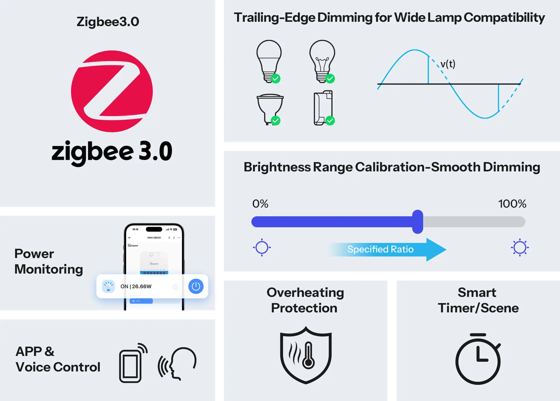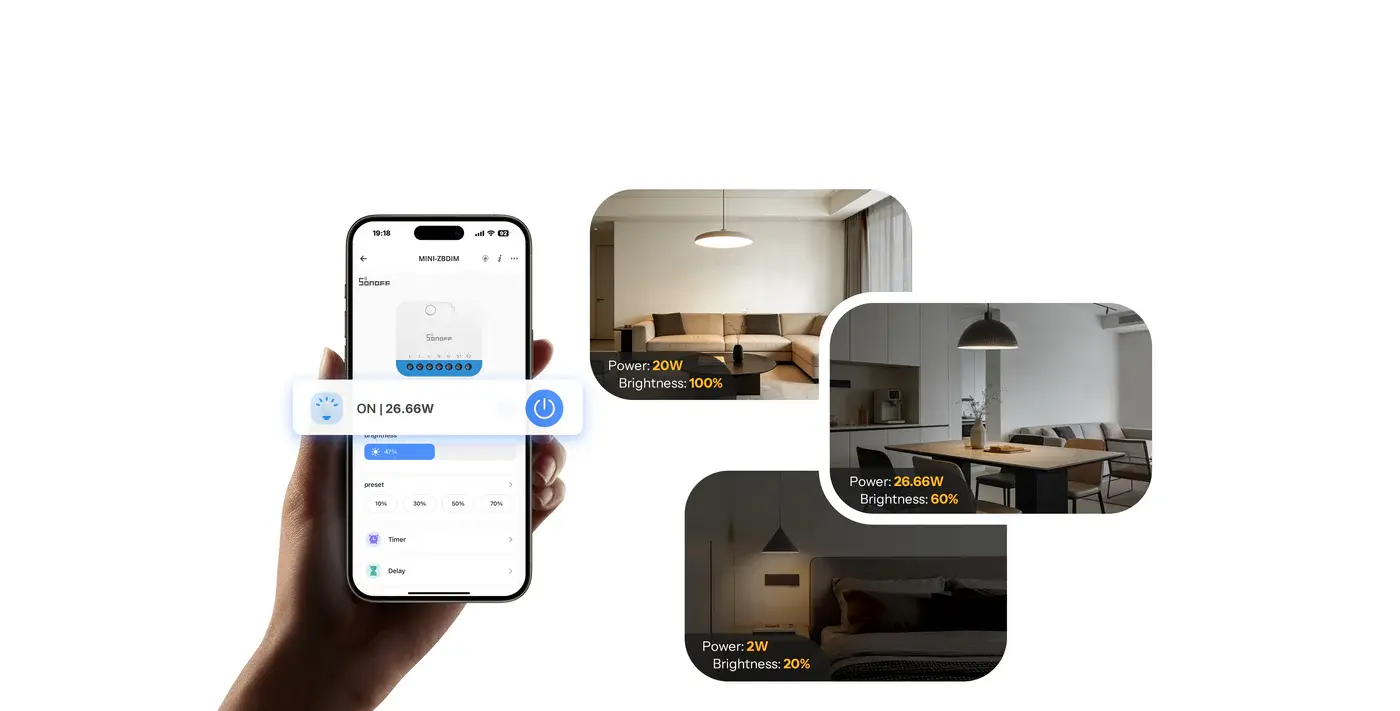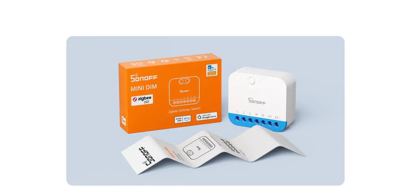 MINI-ZBDIM is a Zigbee smart switch designed for reliable and flexible lighting control. It supports a wide range of loads, including dimmable LEDs, incandescent and halogen lamps, and electronic transformers, and can seamlessly integrate with Alexa, Google Assistant, and IFTTT. With smooth and stable dimming, real-time power monitoring, advanced overheat protection, intelligent scene settings, and support for voice and app control, MINI-ZBDIM delivers safe, smart, and effortless lighting management.