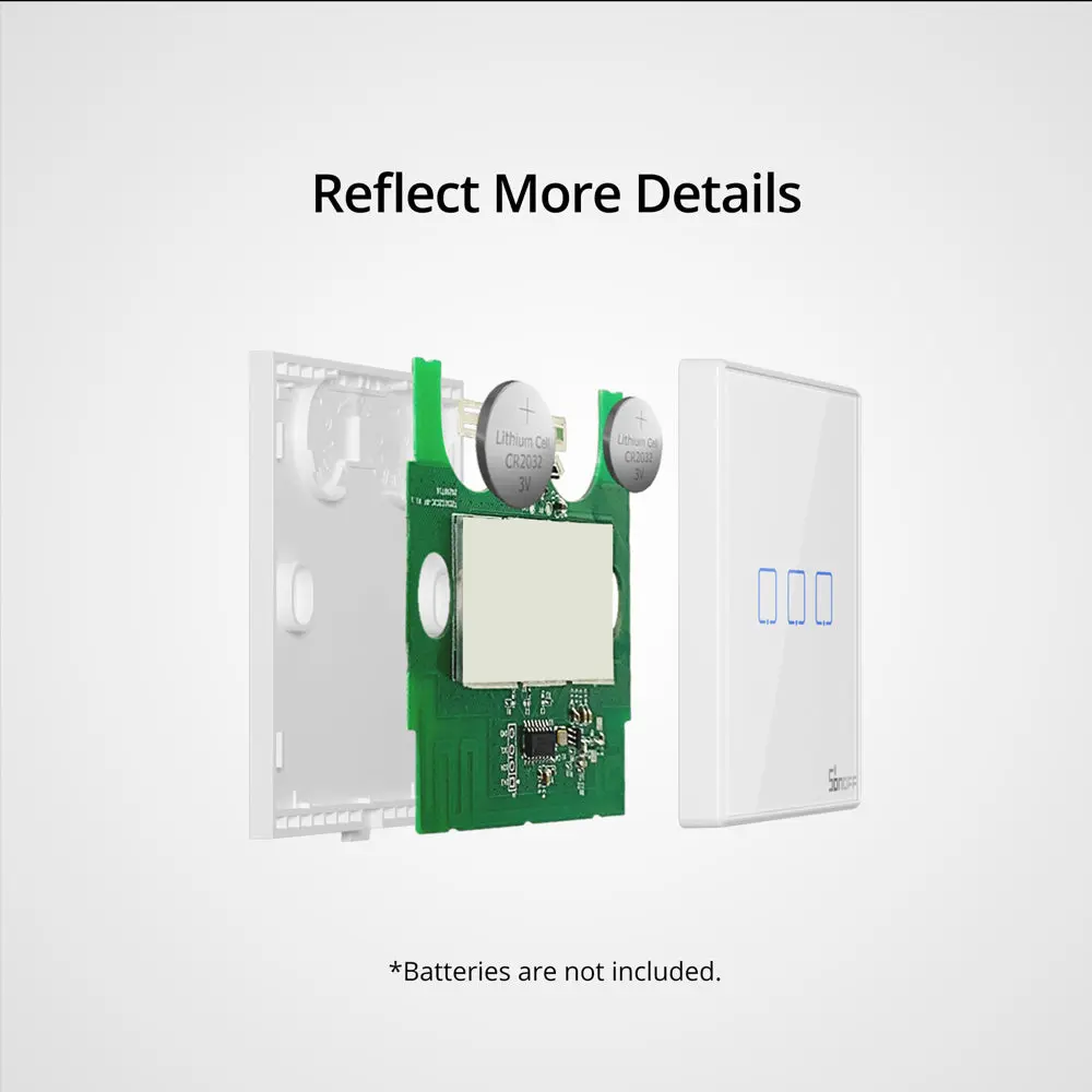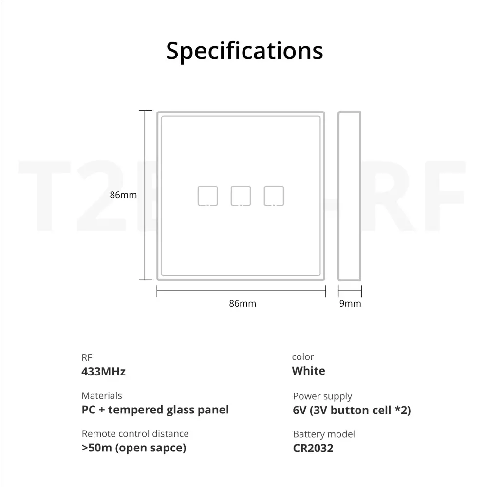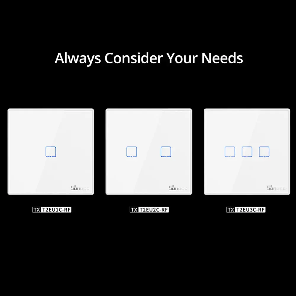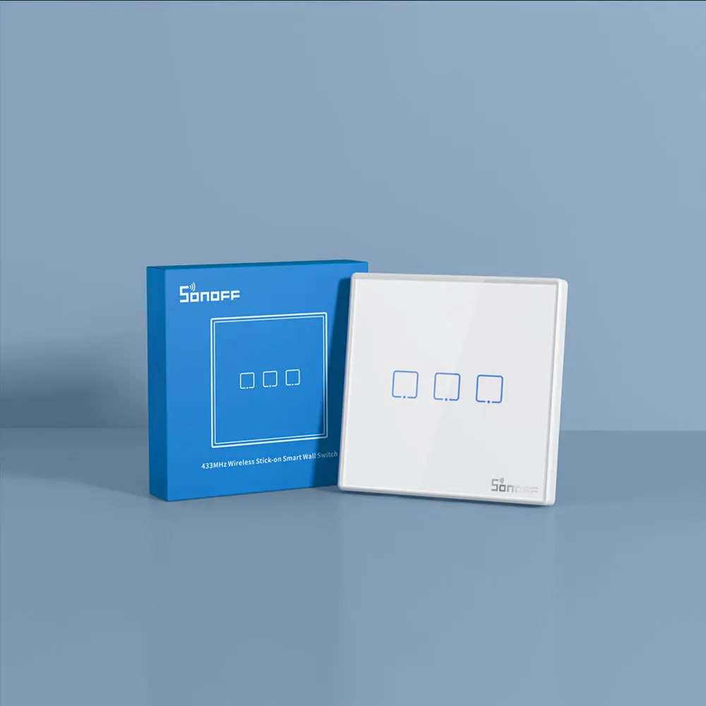 SONOFF T2EU-RF Wall Panel RF Remote features a sleek glass panel with touch buttons and adjustable LED backlight. Available in 1/2/3-gang options. No wiring needed—just stick on and pair with 433MHz RF devices. Battery powered (not included).