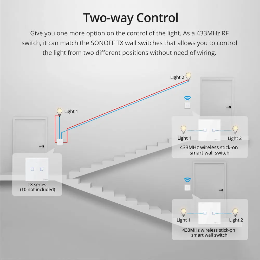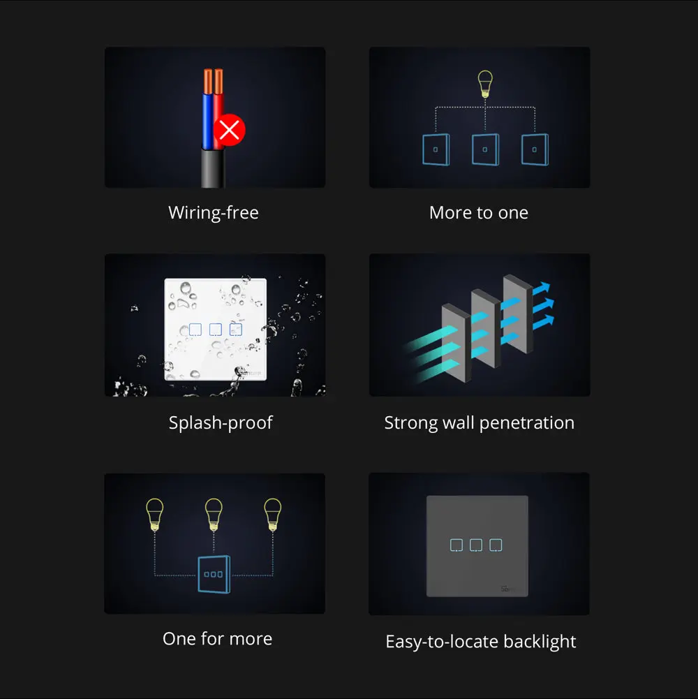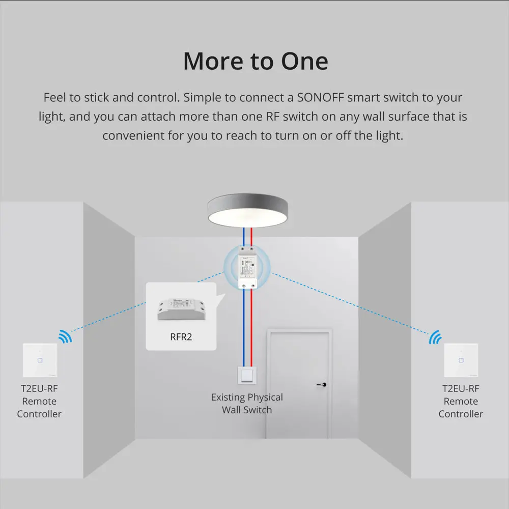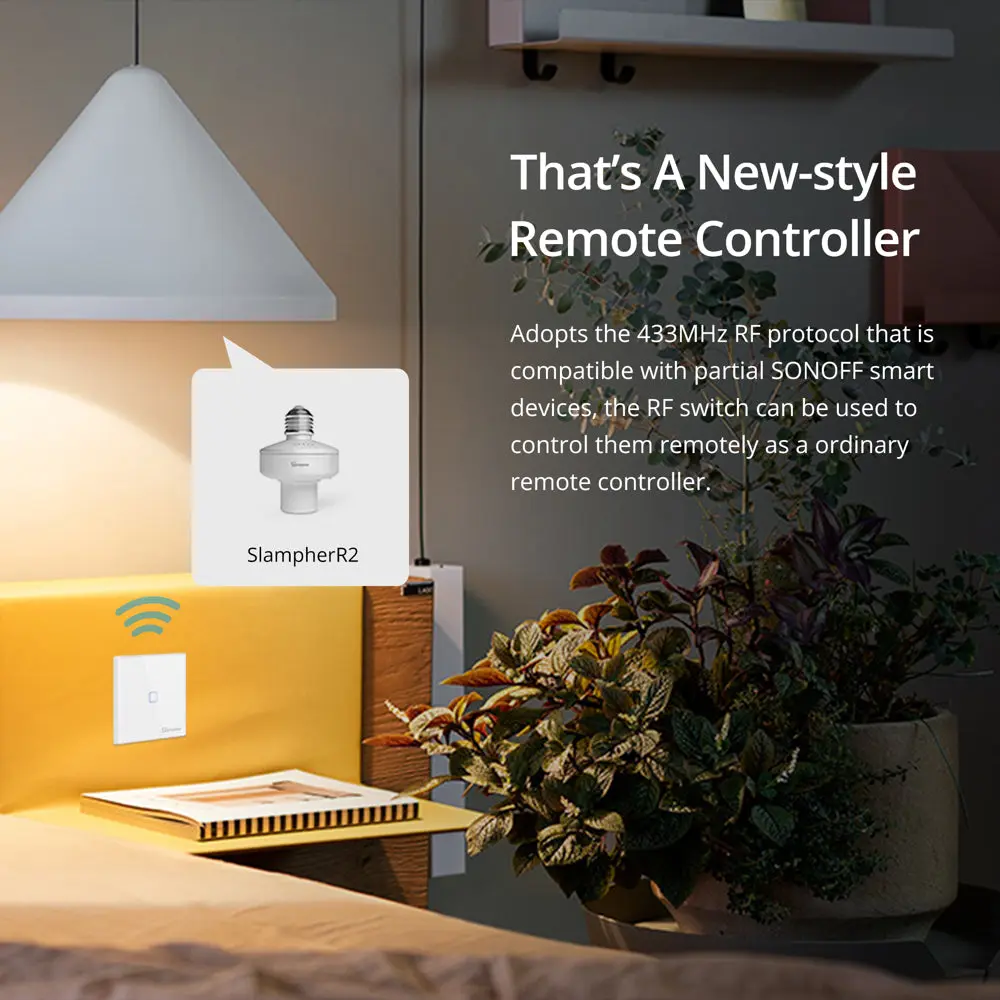 SONOFF T2EU-RF Wall Panel RF Remote features a sleek glass panel with touch buttons and adjustable LED backlight. Available in 1/2/3-gang options. No wiring needed—just stick on and pair with 433MHz RF devices. Battery powered (not included).